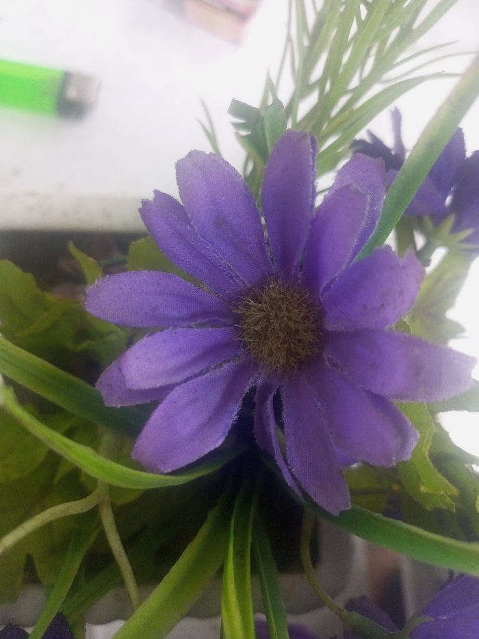 The image displays a close-up, downward-angled view of an artificial purple flower with a textured, dark brown center and multiple fabric petals