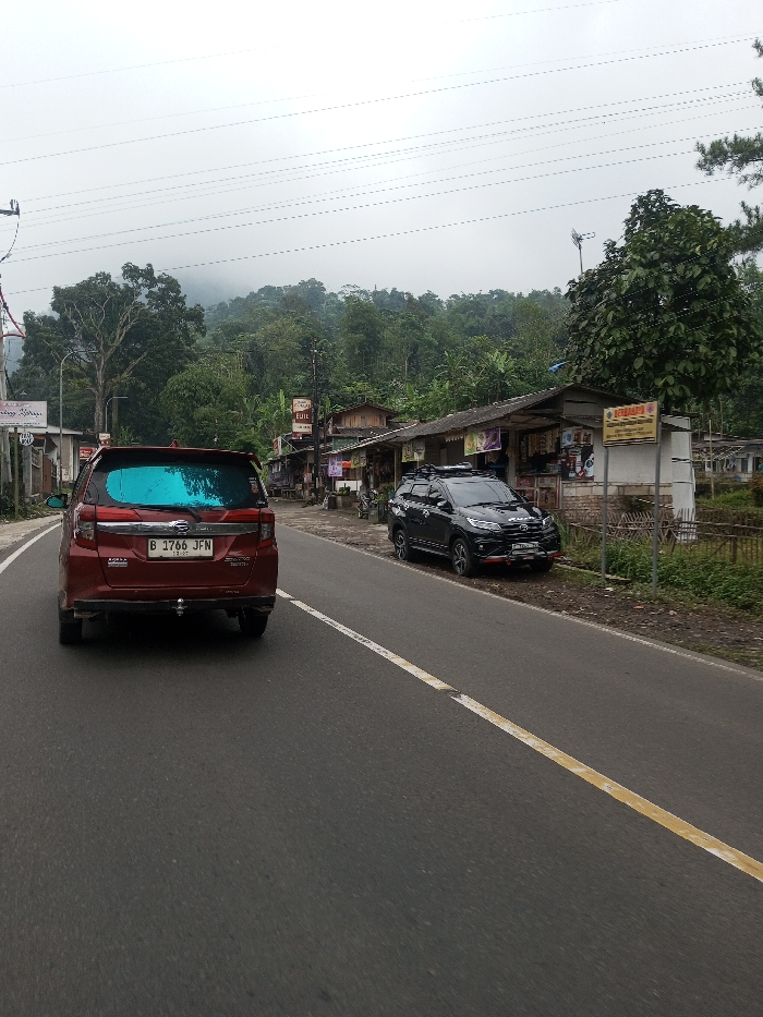 The image captures a two-lane asphalt road in a rural or semi-rural, mountainous setting under an overcast sky. A red minivan, equipped with a tow hitch and featuring a blue-tinted rear window, occupies the left lane, positioned with its rear facing the viewer. Its license plate, "B 1766 JFN", indicates an Indonesian registration. A black SUV with a roof rack and red bumper accents is parked on the right shoulder, facing the direction of travel, adjacent to a row of single-story roadside establishments. These structures have simple roofs and display various signs, including one prominent yellow and black sign reading "BERBUAHI" and another partially visible sign labeled "Euil". Electrical power lines run across the upper portion of the frame. Dense green forested hills rise in the background, partially obscured by mist or low clouds. A section of fence constructed from horizontal wooden or bamboo sticks is visible along the right side of the road. No individuals are clearly discernible.