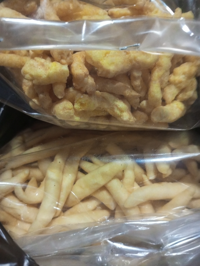 - "Two bags of fried dough snacks are stacked atop one another, partially visible through transparent plastic bags" by FM-zlEjL2, licensed under CC BY 4.0