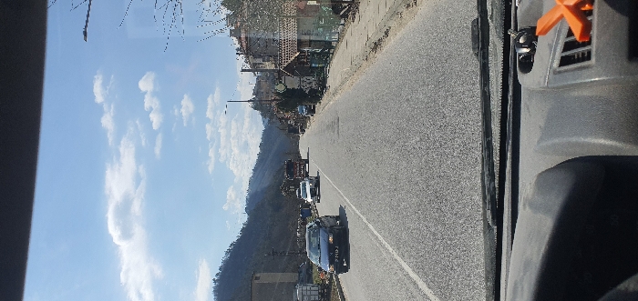The image depicts a daytime street scene from the perspective of a vehicle's dashboard looking forward through the windshield. The location is an arterial road in or near Rustan, Bulgaria. **Environment:** The sky is predominantly clear blue with scattered white cumulus clouds. Bright sunlight illuminates the scene, casting soft shadows. Hills or mountains covered in sparse vegetation, possibly trees, are visible in the background on the left. **Road and Traffic:** A two-lane asphalt road, one lane for each direction, extends into the distance. Vehicles are observed traveling in both directions. In the foreground of the opposing lane, a dark blue sedan, possibly a Renault Clio, with license plate "P 7163 NJ" is approaching. Further down the same lane, a white sedan or small SUV is visible, followed by a large, dark-colored truck, possibly a fire truck or heavy goods vehicle, distinguished by red elements. **Left Side of the Road:** Beyond the opposing lane, to the left, industrial-style structures, including what appears to be stacked metal containers or units, are present. The background on this side is dominated by a forested hillside. **Right Side of the Road:** A concrete sidewalk runs parallel to the road on the right. A single streetlight pole is visible in the mid-ground. Buildings, primarily residential structures with various roof styles including tiled roofs, line the street. Bare deciduous trees are interspersed among the buildings and along the roadside. Further down, additional vehicles are partially visible parked or traveling on the right. **Foreground:** The lower portion of the image shows the dark gray dashboard of the vehicle from which the picture was taken. The lower edge of the windshield and the base of the windshield wipers are visible. An orange, plastic, four-pronged object is attached to an air vent on the right side of the dashboard. No individuals are visible in the scene.