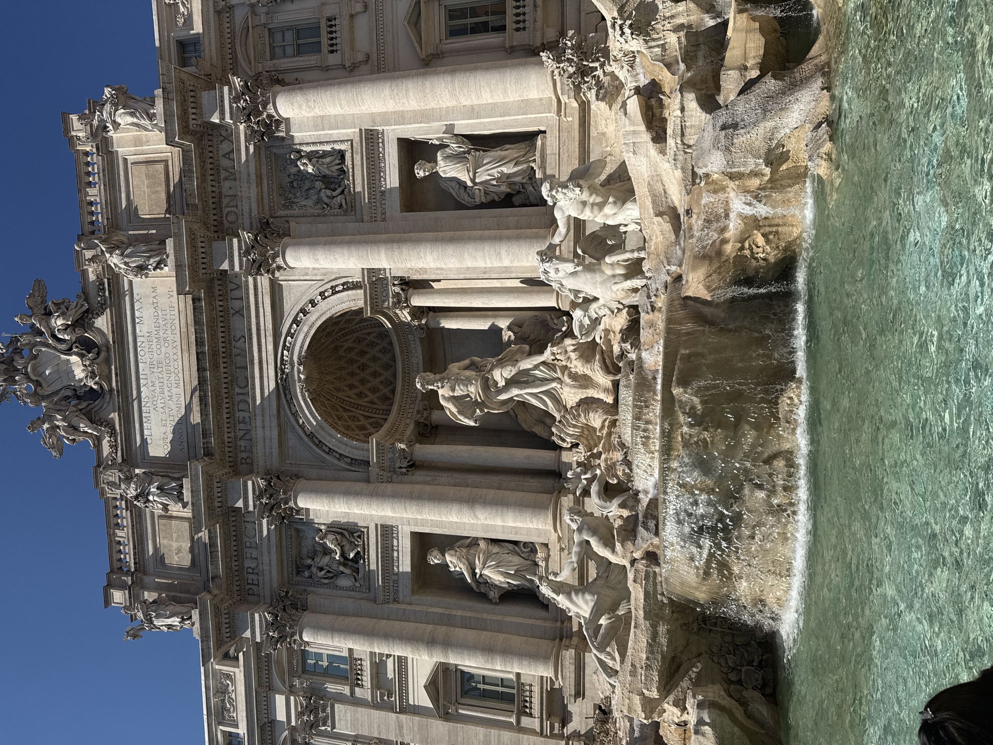The image displays the Trevi Fountain in Rome, Italy, viewed frontally under a clear blue sky. The central feature is the grand Baroque facade of Palazzo Poli, serving as the fountain's architectural backdrop. This facade features a central triumphal arch flanked by four large Corinthian columns supporting an entablature and an attic story. The attic bears a Latin inscription, "CLEMENS XII PONT. MAX AQVAM VIRGINEM...", and is topped by four allegorical statues and Pope Clement XII's coat of arms. Below the attic, a large central niche houses the statue of Oceanus, depicted standing in a shell-shaped chariot pulled by two winged hippocampi. Oceanus is flanked by tritons, one guiding a calm hippocampus on the left, and another controlling an agitated hippocampus on the right. In the niches flanking the central arch are two additional statues: "Abundance" to the left, holding a cornucopia, and "Health" to the right, holding a cup with a snake. Above these flanking niches are bas-reliefs. Water cascades over naturalistic, rough-hewn travertine rock formations beneath the statuary, forming multiple waterfalls that empty into a large, turquoise-green water basin occupying the foreground. The water surface shows ripples and reflections of the bright sunlight. A small portion of a person's dark hair is visible at the extreme bottom-left corner, indicating a viewer's close proximity to the water's edge.