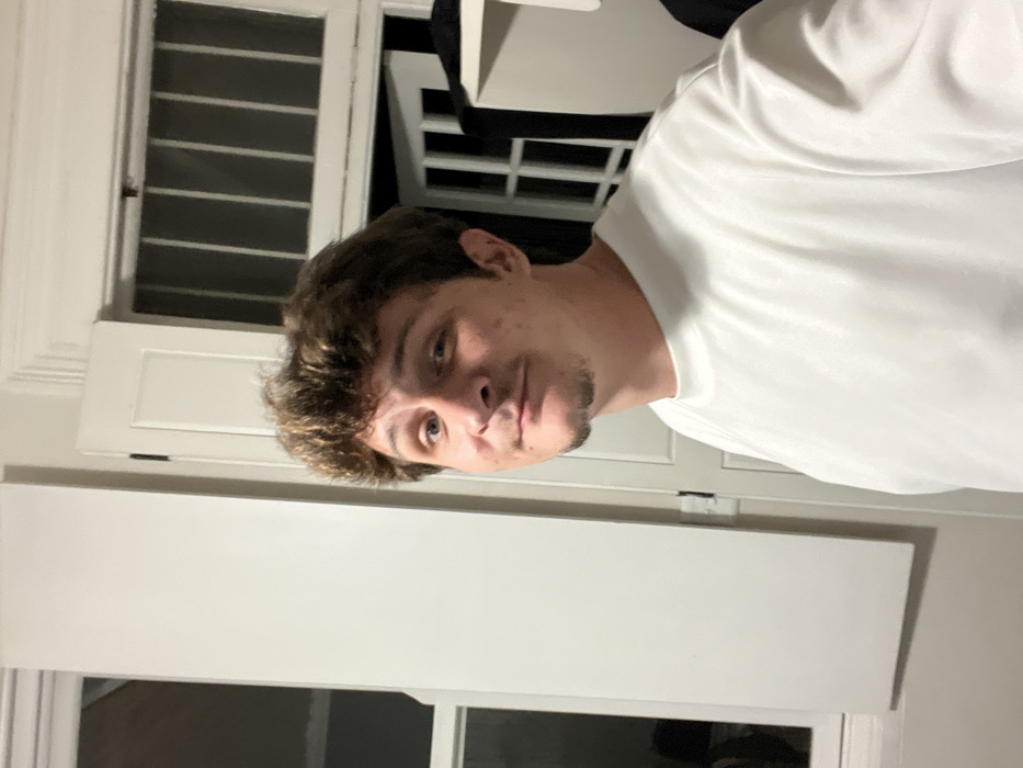 A young man with curly brown hair and light skin stands slightly turned towards the viewer, wearing a white shirt