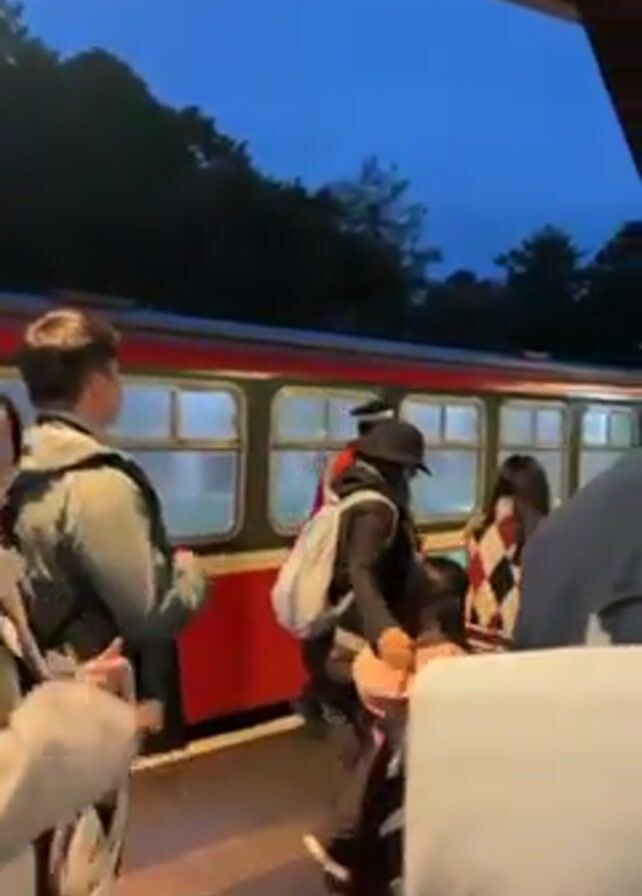 people boarding a red train at dusk. Several individuals with backpacks walk towards the train's open doors, while a train conductor in an orange vest assists passengers. A young child in red patterned leggings holds hands with an adult. The train platform is under a wooden structure. The sky is a dark blue.