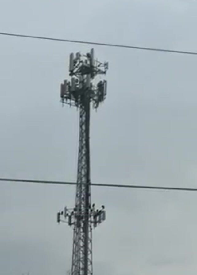 tall cellular tower silhouetted against a grey, overcast sky