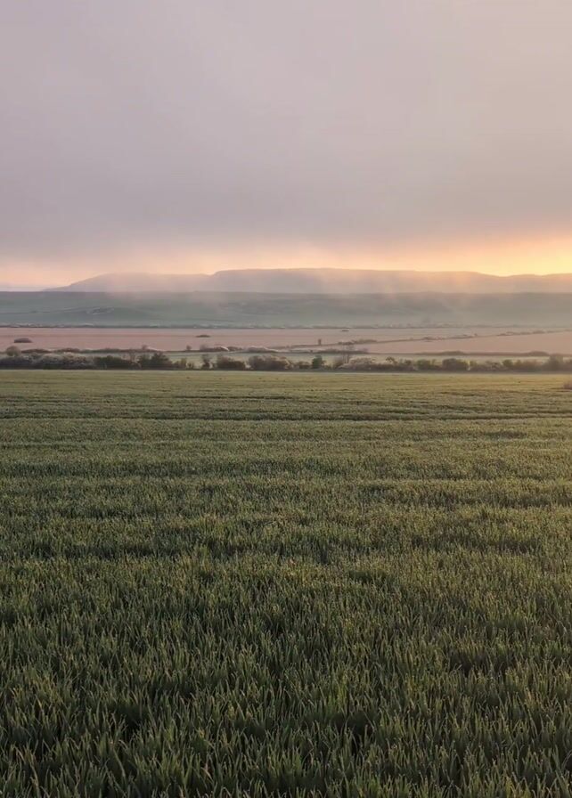 field of green grass, with a mountain range in the background, and the sun rising over the mountains