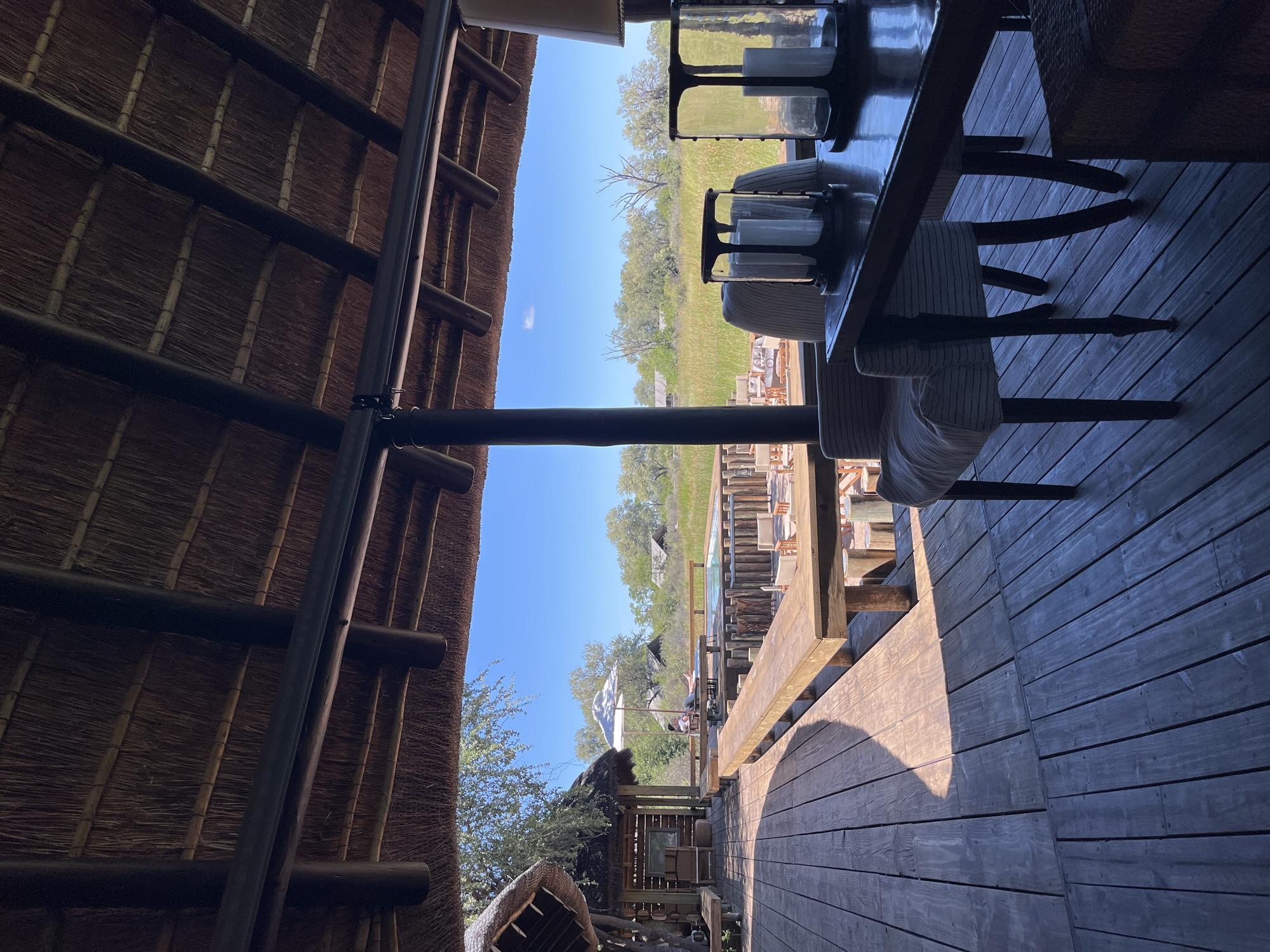 This image was taken from an elevated wooden deck in Khwai, Botswana. The deck is partially covered by a thatched roof supported by wooden beams. A long wooden table with chairs sits on the deck, with lanterns placed as a centerpiece. Beyond the deck, the landscape is visible, featuring grasslands and trees under a clear blue sky. In the distance, structures that appear to be part of a resort or camp are also visible.