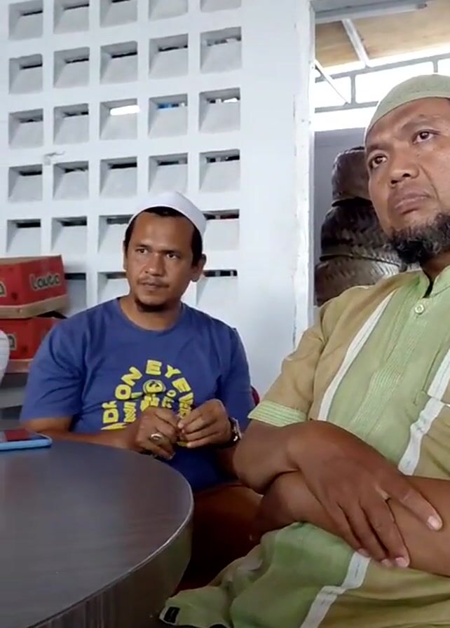 Several men are sitting around a round table. Some of them wear Muslim caps. There are glasses and cups on the table. The men are conversing. The room has a white wall with square openings for ventilation and a clock on the wall. A plant sits near a box labeled "Lauta."