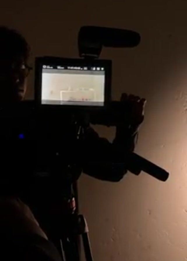 person filming with a professional-looking camera on a tripod in a dimly lit room. The camera has a microphone attached and a screen showing the image being recorded. The person's face is partially visible, showing that they are wearing glasses. The wall behind them is textured and uneven, with a dark area at the top and a brighter area to the right.
