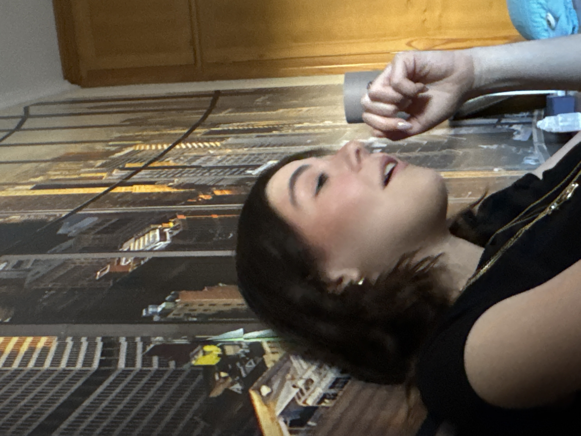 A woman with dark hair and fair skin is lying on a surface with a patterned cityscape design. Her head is turned towards the right side of the frame, with her mouth slightly open. She is wearing a black top with a gold chain. An arm and hand are visible above her head. The background includes a wooden cabinet and a blue object. The location is undeterminable, as there are no recognizable buildings from the city of Mirandela, Portugal visible. The cityscape is abstract.