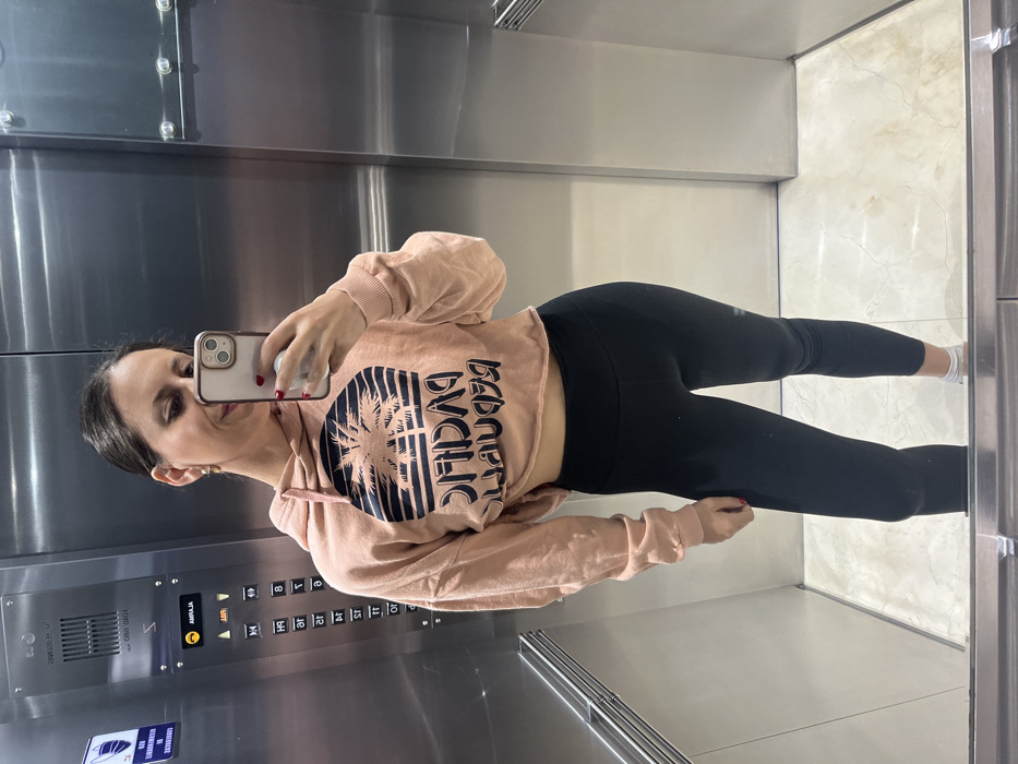 A woman in an elevator takes a selfie. She wears a salmon-colored, cropped hoodie with black text that says "Beach Pacific" under a palm tree design. She also wears black leggings and white socks. Her hair is pulled back. She's holding a phone with a tan case, and has red nail polish. The elevator has stainless steel doors and walls, and a beige tiled floor. An elevator control panel is visible.