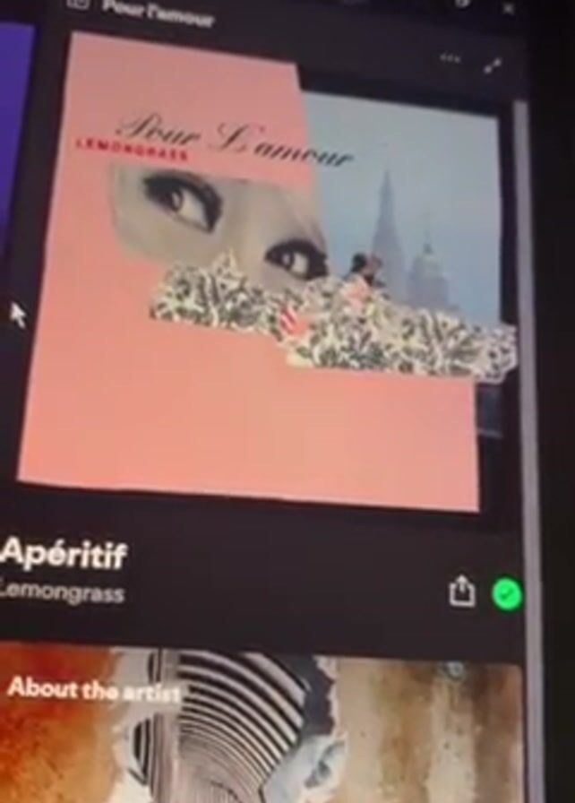 computer screen displaying the Spotify desktop application. The screen displays album art for the Lemongrass album "Pour L'amour", playing the track "Apéritif". The album art features a collage-style design incorporating a pair of eyes, a floral-patterned section, and a pink background, with the album name and artist displayed in text. Below this is an "About the artist" section with another image. The user interface elements of the Spotify app, such as the song title, artist name, and download icon, are visible, indicating the selected song is currently playing. The camera zooms in for a closer look at the album art.