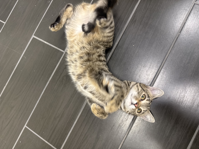 The image depicts an indoor scene located in Lozen, Bulgaria. A domestic tabby cat is observed lying supine on a dark gray tiled or planked floor. The feline has a coat patterned with brown, black, and tan stripes, green-yellow eyes, and a pink nose. Its front paws are partially curled and elevated; its hind legs are bent. The cat's head is oriented upwards towards the camera. The flooring consists of rectangular dark gray sections with light gray seam lines, occupying the entire visual field.
