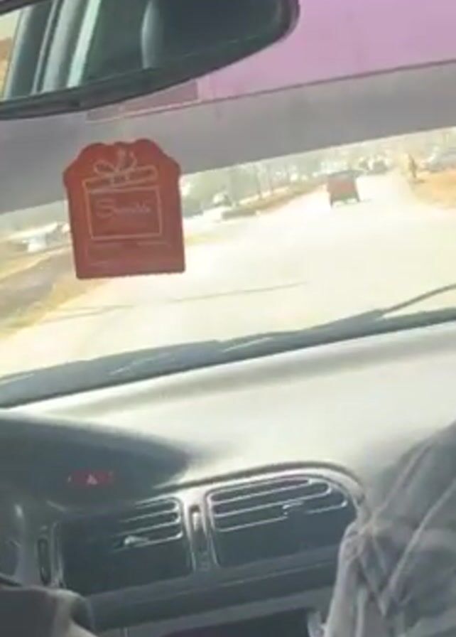 A view from inside a car traveling on a road. The driver is wearing a plaid shirt and headphones. A three-wheeled vehicle can be seen ahead on the road. An air freshener hangs from the rearview mirror. The car's dashboard and interior are visible. The sky is bright.