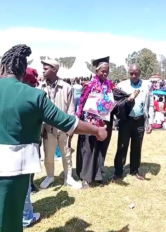 Here is a detailed description of the video: The video shows a group of people gathered on a grassy field under a sunny sky. A person in a graduation gown, cap, and a colorful garland stands in the center, holding a gift and a piece of food that appears to be bread. Two people stand on either side of the graduate, one in a tan jacket and the other in a blazer with dark pants. Another person wearing a green and white outfit is standing slightly in front, appearing to be taking video or photos. In the background, there is a larger crowd of people, with some sitting on the ground and others standing. There are tents and trees visible in the distance, suggesting an outdoor event or celebration. The video appears to be taken at ground level, with some movement as the camera person adjusts their position.