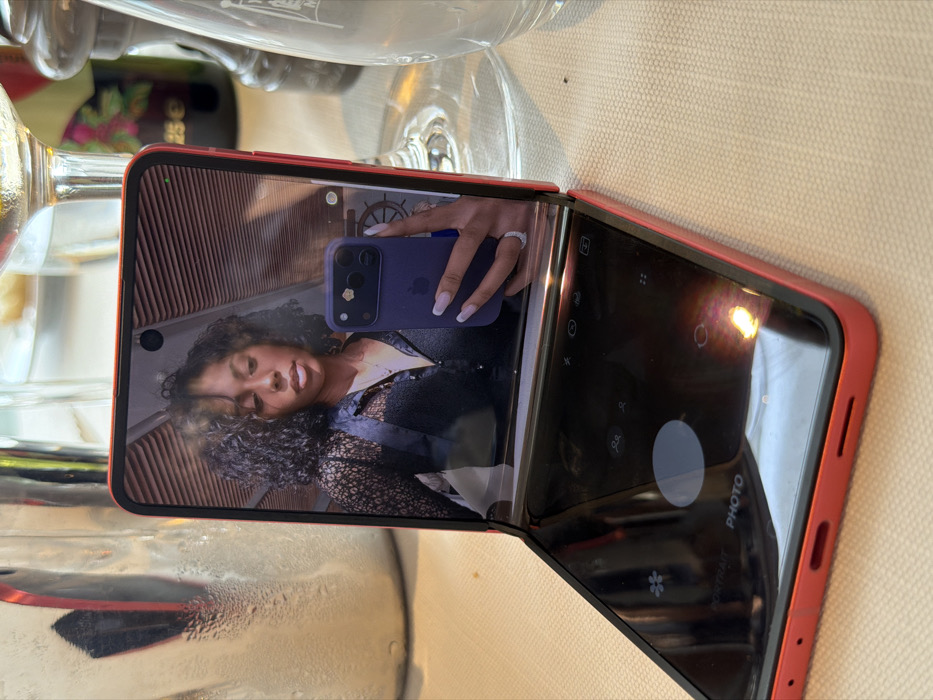 A red foldable smartphone is displayed partially open, resting on a light-colored woven tablecloth. The upper screen exhibits a frontal selfie of a woman with dark, curly hair. She is wearing a black lace-sleeved top over a dark button-up shirt and holding a purple-cased iPhone with her left hand. A silver-toned ring is visible on her left ring finger, and her nails are manicured with light-colored polish. The background of the selfie includes horizontal paneling and a faint circular object resembling a ship's wheel. The lower screen of the foldable phone shows a camera interface with "PHOTO" mode selected and various control icons. Surrounding the device on the table are a silver metallic water pitcher exhibiting condensation, transparent stemmed glassware, and a dark bottle, indicating a dining environment. This scene is located in Monaco, Monaco.