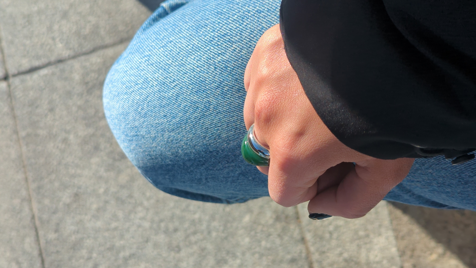 A close-up shot focuses on a person's hand, adorned with a prominent green and silver ring on the ring finger