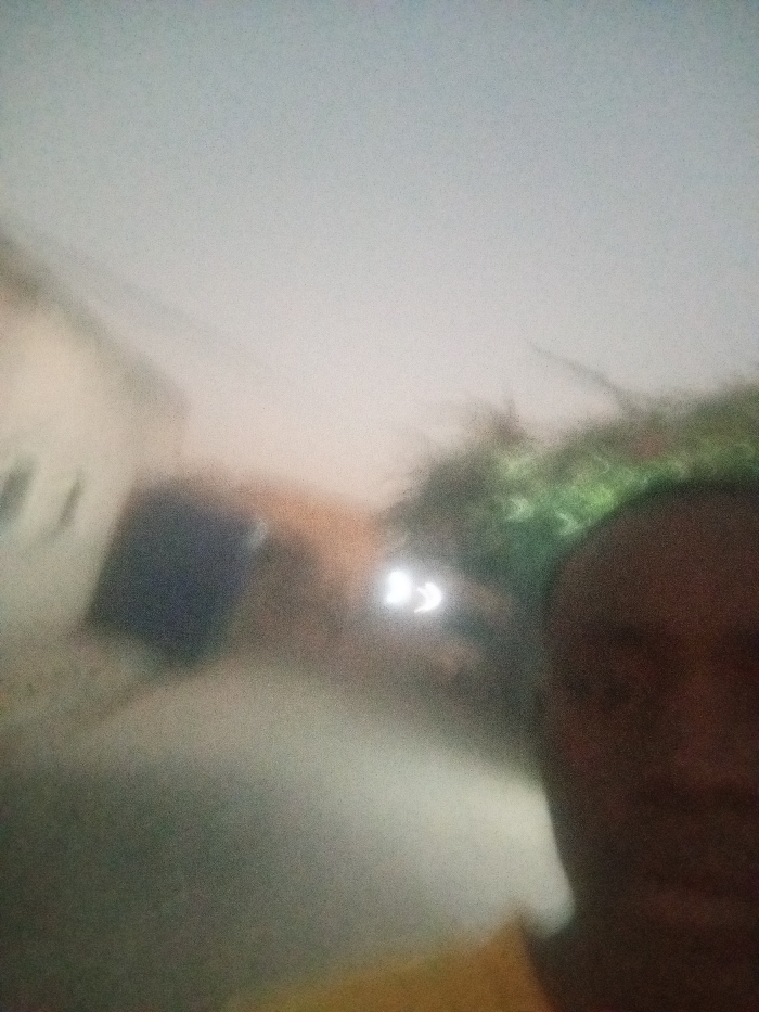 The image depicts an outdoor scene in Gwagwarwa, Nigeria, rendered with significant blur and grain due to low light conditions. In the foreground, positioned on the right, is the blurry right side of a human head and shoulder, identifiable by dark skin tone and a visible yellow garment worn on the shoulder. The midground features two distinct, bright, crescent-shaped white light sources, consistent with vehicle headlights, situated slightly left of center. To the left, a light-colored building with dark rectangular openings is partially visible. Further right in the midground, dense green foliage is present. A muted light-colored surface, consistent with a road or pathway, occupies the lower portion of the frame. The sky above is a pale grey-blue.
