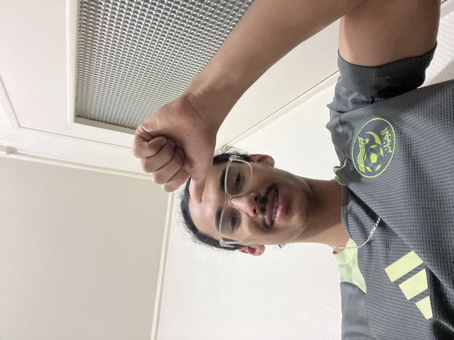 A person with glasses and a gray soccer jersey with a green emblem is looking at the camera and holding a thumbs down. The person is indoors with a textured ceiling panel above them and plain white wall behind. The image is rotated counter clockwise.