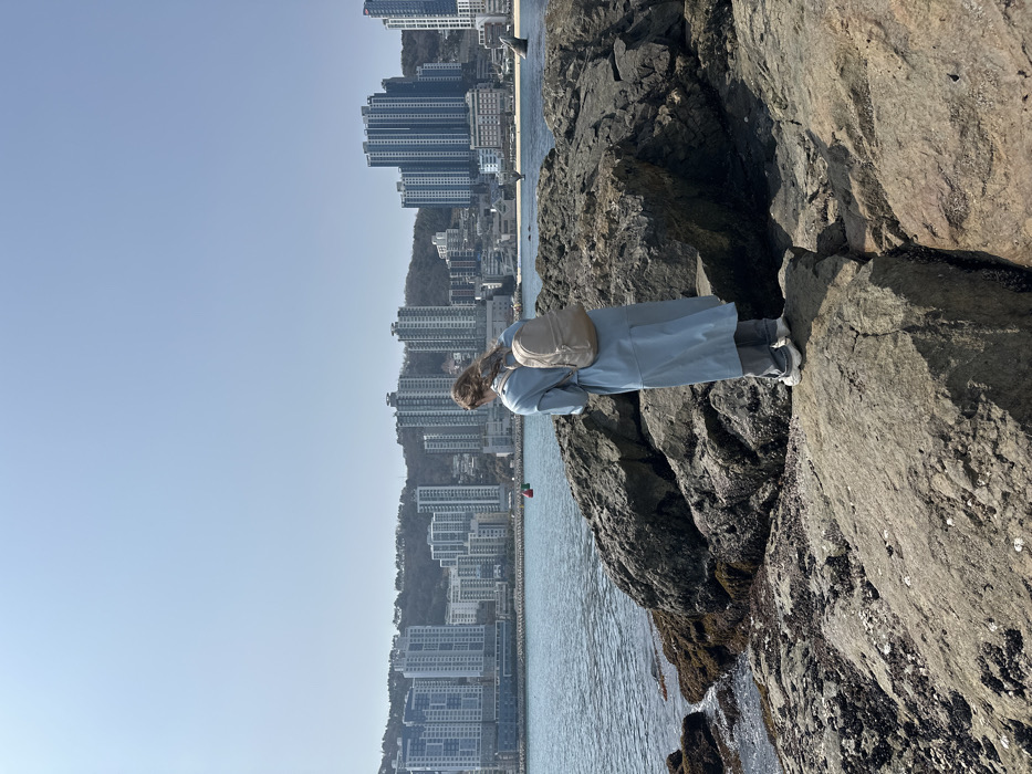 A single individual, appearing female, is observed from behind, standing on large, irregular grey and brown rock formations at the edge of a body of water. The person wears a light blue long-sleeved tunic extending to the mid-calf, grey trousers, and white athletic shoes. A light beige backpack is worn. Hair is partially visible, styled up or braided, with some strands in motion. To the left, water laps against the rocks, some of which are covered in dark marine growth. A red cylindrical buoy floats in the water in the midground, slightly to the left of the central axis. Beyond the water, a dense urban skyline dominates the background, featuring numerous high-rise residential and commercial buildings. These structures are predominantly light-colored and extend up a gently sloping hillside covered with sparse vegetation. The sky is clear and light blue, indicating bright daylight. The scene is located in Busan, South Korea, likely from a coastal point such as Dongbaek Island, looking towards the Haeundae or Marine City area.