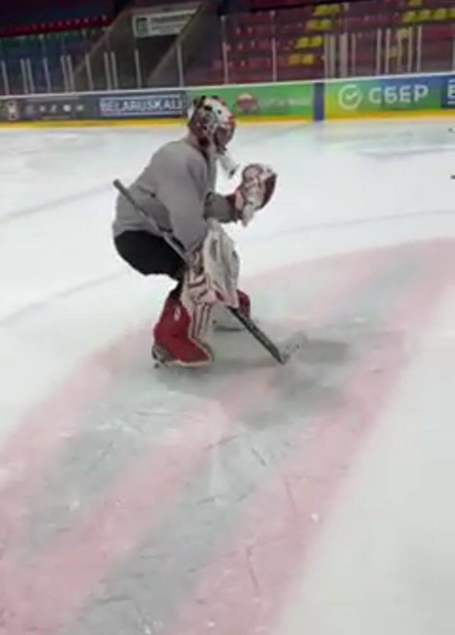 In a wide shot indoors, a hockey goalie practices on the ice. The goalie is wearing a grey long-sleeved shirt, black pants, red and white leg pads, a helmet, and white and red gloves. They are in a squatting position with their stick held in front of them. Several pucks are scattered on the ice nearby, and pucks are being shot at the goalie from an unseen shooter off-screen. The goalie moves to block the shots. Behind the goalie are red stadium seats and signs in various languages, including "BELARUSKALI" and other branding. The ice rink is well-lit, and the overall environment suggests a professional hockey training setting.