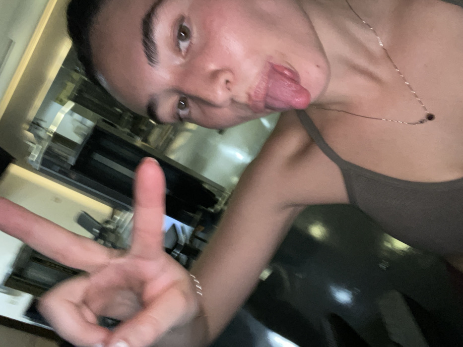 The image displays a female individual taking a selfie indoors. Her upper torso and face are visible. She has a flushed complexion and is wearing a dark olive-green ribbed tank top and a thin, silver-toned necklace with a small dark circular pendant. Her left hand is raised to her left side, forming a "peace" sign with her index and middle fingers extended. Her tongue is extended out of her mouth. The background is significantly blurred, showing reflections in what appear to be mirrored walls, consistent with a gym or fitness center, with indistinct dark shapes suggestive of exercise equipment. The specific location within Mexico City, Mexico, cannot be determined from the visual information provided.