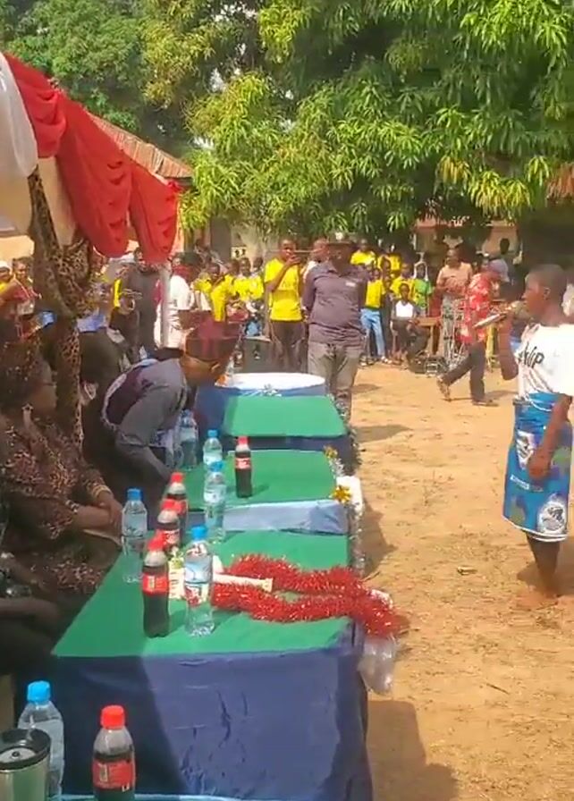 group of children performing a traditional dance in an outdoor setting. The children are dressed in white shirts and blue patterned skirts. One child stands while the others are kneeling or leaning forward. In the background, a larger group of people, some wearing yellow shirts, sit on benches watching the performance. There is a table covered in green and blue cloths with bottles of water and soda. Behind the table are seated adults. The area is shaded by trees, and a tent is visible in the background. One person is carrying an item on her head and uses a walking stick.