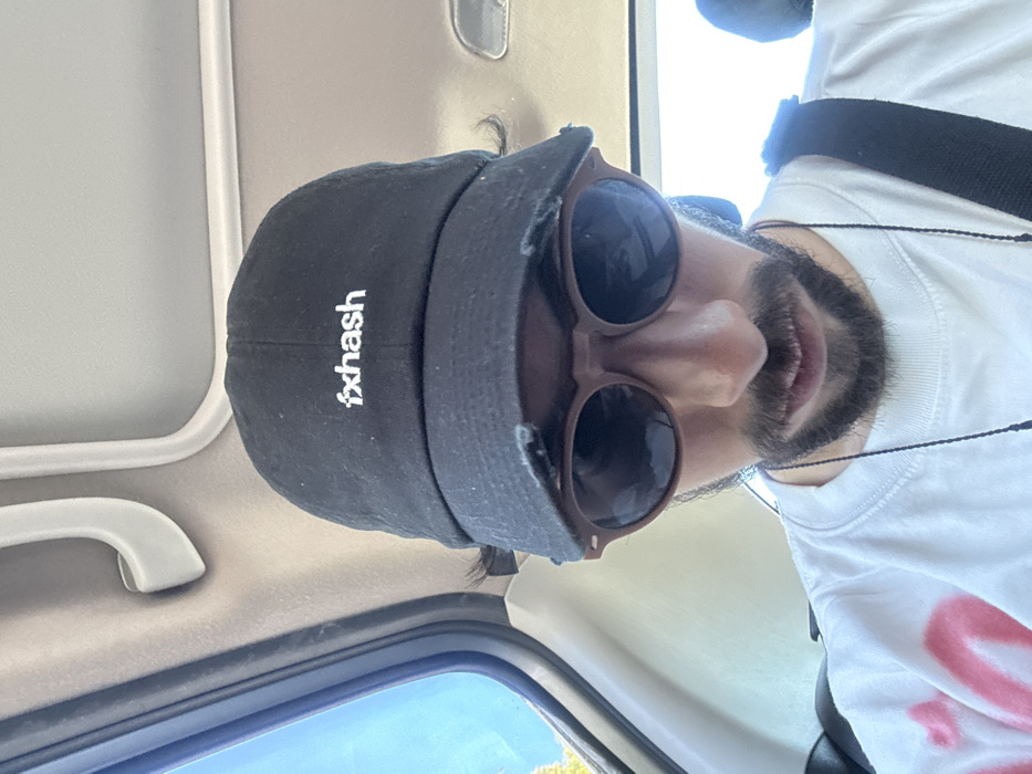 A person wearing a black cap with "fxhash" written on it, round sunglasses, and a white t-shirt with a black strap visible. The person has a beard and is inside a vehicle, possibly a car. The interior includes a grey roof and a handle. The windshield shows a glimpse of the sky and possibly trees outside. The angle is slightly tilted.