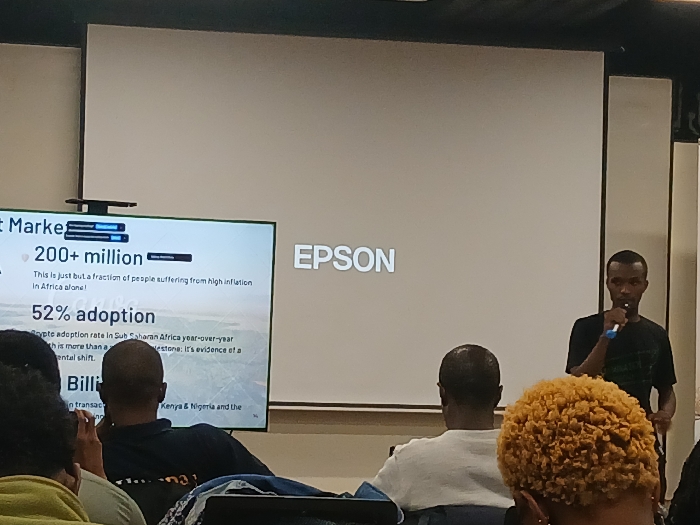 An indoor presentation is underway in a conference room or lecture hall in Nairobi, Kenya. A dark-skinned male speaker, wearing a dark short-sleeved shirt, stands on the right side of the frame, holding a blue-tipped microphone to his mouth. Behind him are two projector screens. The left screen displays a presentation slide with text indicating "Market," "200+ million" (followed by "This is just but a fraction of people suffering from high inflation In Africa alone!"), "52% adoption" (describing "Crypto adoption rate in Sub-Saharan Africa year-over-year... It's evidence of a mental shift."), and mentions "Kenya & Nigeria." A projector is mounted above this screen. The larger right screen prominently displays the word "EPSON" in light gray capital letters on an otherwise blank white surface. An audience is seated, viewed from behind, facing the screens and the speaker. Visible audience members include an individual with light brown, tightly curled hair in the immediate foreground, and others wearing dark polo shirts and white t-shirts.