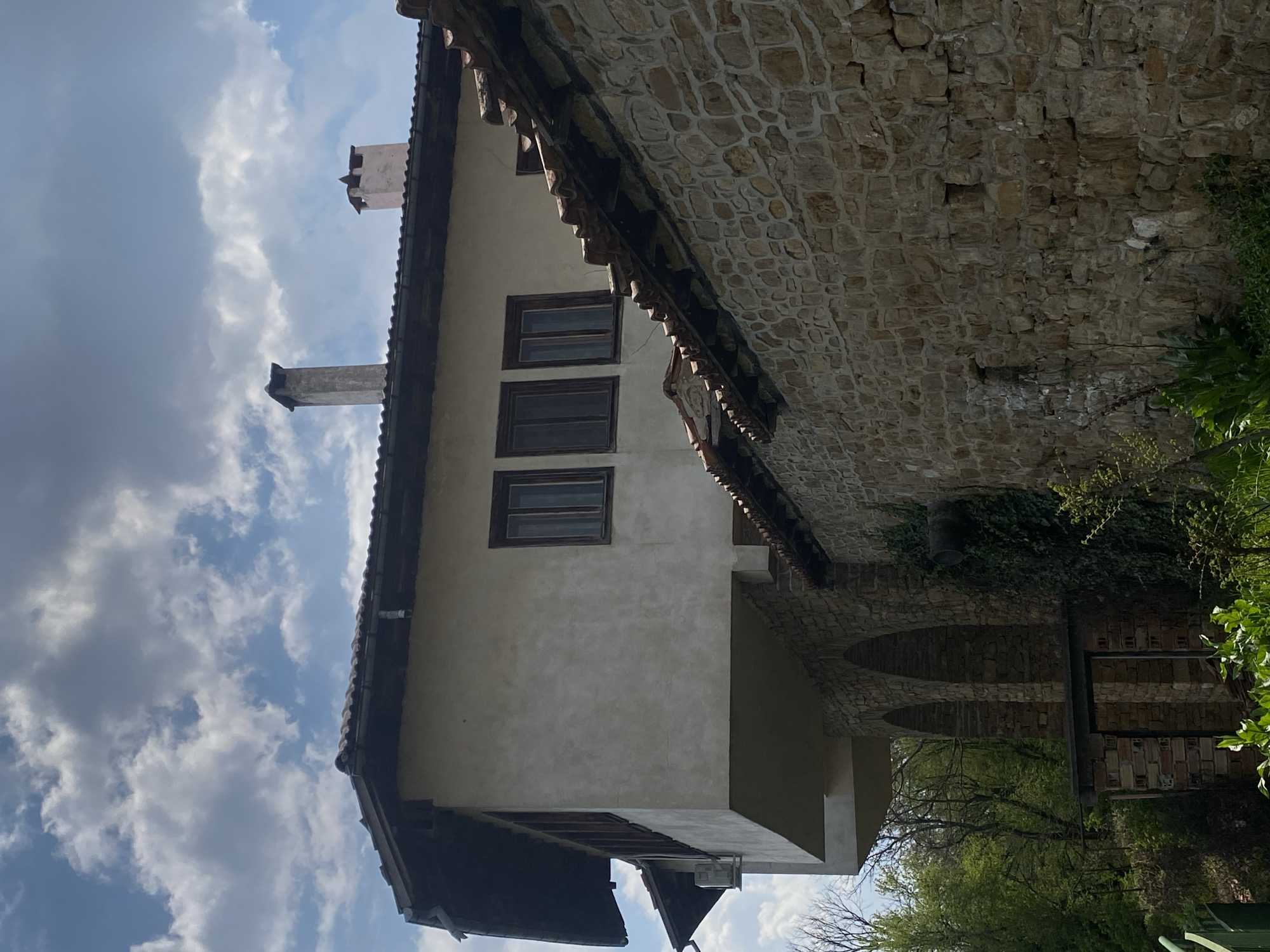 building in Lyaskovets, Bulgaria. The building has a stone facade and a white stucco section with three windows. There are two chimneys visible on the roof. The sky is partly cloudy. Part of the building appears to be built over an arched walkway. Vegetation is visible in the foreground.