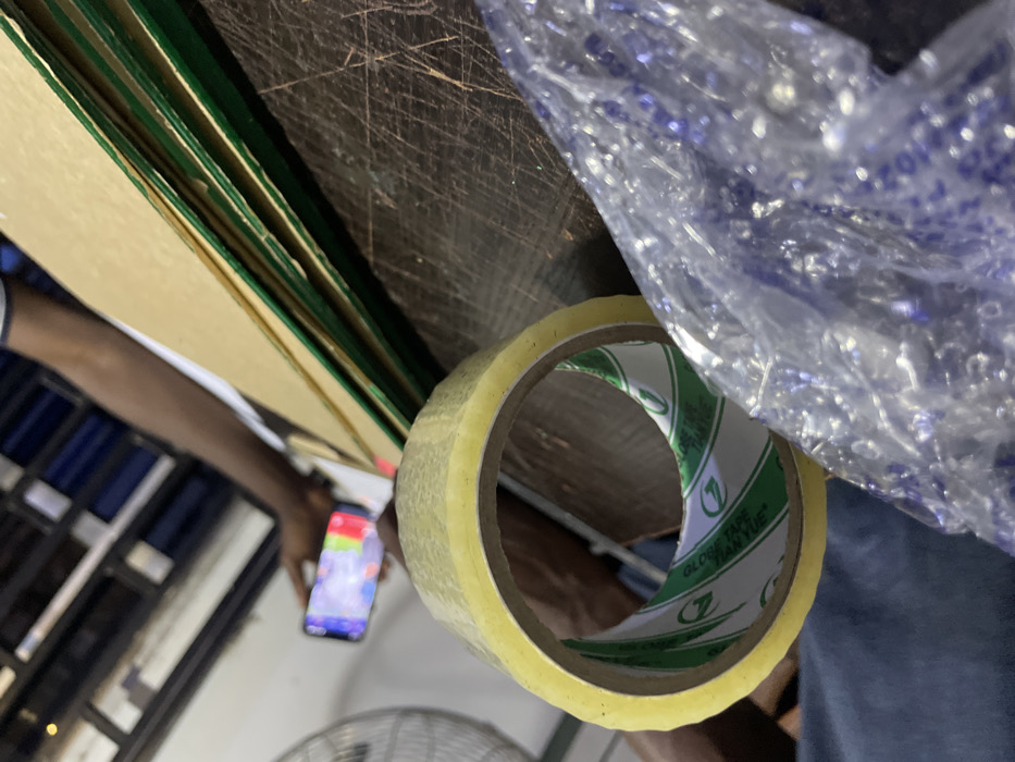 A roll of clear tape sits on a wooden surface, next to a stack of acrylic sheets with green edges and bubble wrap. A person holds a lit-up smartphone in their left hand, and their right hand is near the tape. An oscillating fan is visible in the background.
