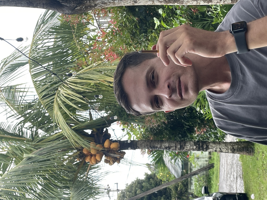 A man wearing a grey t-shirt and a black smartwatch holds a lit cigar. He is outdoors, possibly in a tropical location, as indicated by a palm tree laden with yellow coconuts. The tree is adorned with decorative lights. A building and a parked car are visible in the background, alongside other lush vegetation. The image is taken from a slightly low angle and is rotated counter-clockwise.