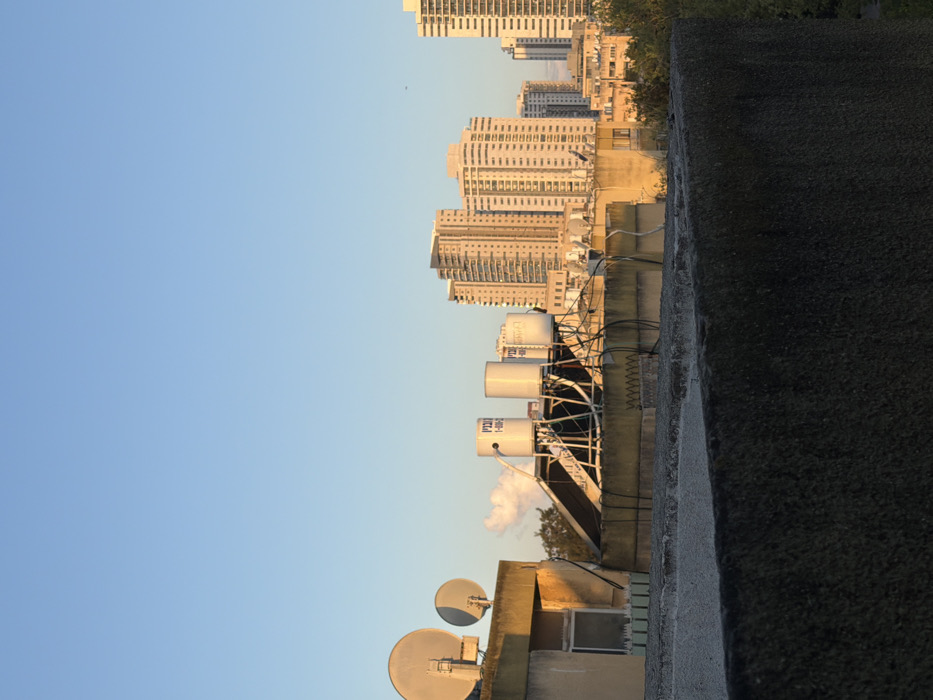 The image displays an urban cityscape in Kiryat Bialik, Israel, viewed from an elevated perspective under clear, light blue skies, indicating late afternoon lighting. A dark gray, coarse-textured concrete parapet occupies the immediate foreground. In the midground, the rooftops of several buildings are visible. On the left, a light-colored building's roof features two off-white parabolic satellite dishes, varying in size, positioned with their concave faces upwards. A window opening is present below them, and a green spiked barrier is installed along the roof's edge. To its right, another building's rooftop hosts at least three white cylindrical water tanks, vertically mounted on a metallic support structure, situated above dark-colored solar hot water panels. Hebrew text, specifically "מבטיח" and "1-800-2", is legible on the side of the central water tank. Black electrical wiring is routed across this rooftop, which also displays a yellowish spiked anti-perching strip along its perimeter. A small, white, isolated cloud or industrial plume is visible against the sky, positioned to the left of the distant buildings. The background is dominated by a cluster of numerous modern, multi-story residential high-rise buildings. These structures exhibit light-colored facades, uniformly illuminated by the warm, low-angle sunlight. Green foliage is sparsely visible at the lower levels between the midground rooftops and the taller background buildings. A minute dark speck, consistent with a bird or distant insect, is observable in the upper right quadrant of the sky. No human figures are present or identifiable within the scene.