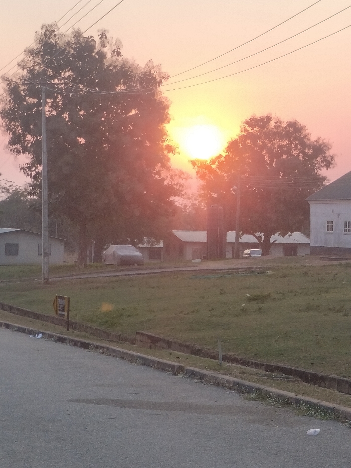 A vibrant sunset dominates the background, casting a warm glow over the scene. Two trees frame the sun, partially obscuring it. Buildings dot the landscape, with a car parked in front of one. A grassy area stretches out in front of the buildings, meeting a street in the foreground. A small sign stands near the street. Power lines run across the sky above the trees.