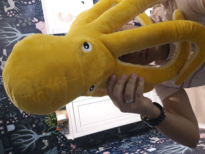 A person holds a large, bright yellow plush octopus. The octopus has eight long tentacles and two simple, circular eyes. The person wears a ring on their finger and a watch on their wrist. In the background, there's a floral patterned wallpaper and a white dresser. A framed artwork hangs above the dresser. The overall scene feels whimsical and playful.