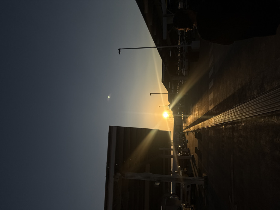 A sideways view showcases a sunset on an industrial landscape. A bright sun shines between structures, casting strong beams across a surface. Streetlights line the area. In the upper right, an unrecognizable person stands by the ledge. The sky fades from light to dark, adding contrast.