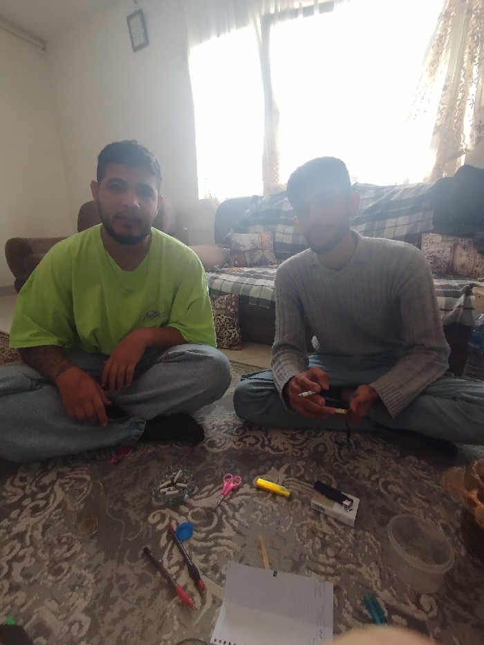 The image depicts two adult males seated cross-legged on a patterned rug in an indoor residential setting, identified as a location in the city of Parand, Iran. Both individuals have short dark hair and facial hair. The male on the left wears a neon green short-sleeved t-shirt and light blue jeans, with visible tattoos on his right forearm. He is looking directly at the camera. The male on the right wears a ribbed gray long-sleeved sweater and light blue pants; he is holding a lit cigarette in his left hand and a dark rectangular object, possibly a mobile phone or game controller, in his right hand. His gaze is directed downwards towards the objects in his hands. Between the two individuals on the rug, various items are scattered: a glass ashtray containing multiple cigarette butts, a pair of pink scissors, a yellow highlighter, a white cigarette pack, a black lighter, two pens (one black, one red), an open spiral notebook with writing, and a clear plastic container with a lid. In the background, bright natural light streams through two windows covered with patterned curtains. A brown sofa with patterned cushions and a plaid blanket draped over it is visible behind the male on the right, and another brown furniture piece is partially visible on the left. A small, dark-framed picture hangs on the light-colored wall. A plastic water bottle and a woven basket are partially visible near the sofa on the right.