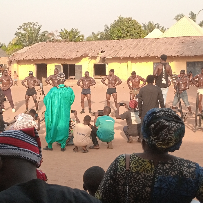 In Akwanga, Nigeria, an outdoor event unfolds on an unpaved, sandy surface in front of a single-story, yellow-painted building with a brown corrugated metal roof. Nine men, most of whom are shirtless and appear oiled, stand in various bodybuilding poses, displaying their musculature. They wear dark-colored shorts or brief-like attire, with one individual on the far right wearing light-colored briefs and another on the far right in denim shorts. One man among the bodybuilders wears a black tank top with "MAXIMUM" written on it. In the mid-ground, a man in a vibrant green traditional robe stands facing the bodybuilders, positioned near a black tripod set up on the ground. Several individuals are crouched or seated on the ground in front of him, actively photographing or videoing the posing men with smartphones. One person is wearing a light blue t-shirt with "Hephzibah 2024" visible, and another a light brown t-shirt with "BE LIKE JESUS." In the immediate foreground, the backs of several spectators are visible, observing the scene. This includes an individual in a red and white striped knit hat and another in a patterned blue, black, and yellow headwrap and matching garment. The background features lush green foliage, including palm trees, and a second building with a light-colored, possibly pyramidal roof further behind the main yellow structure. The sky is bright and hazy.