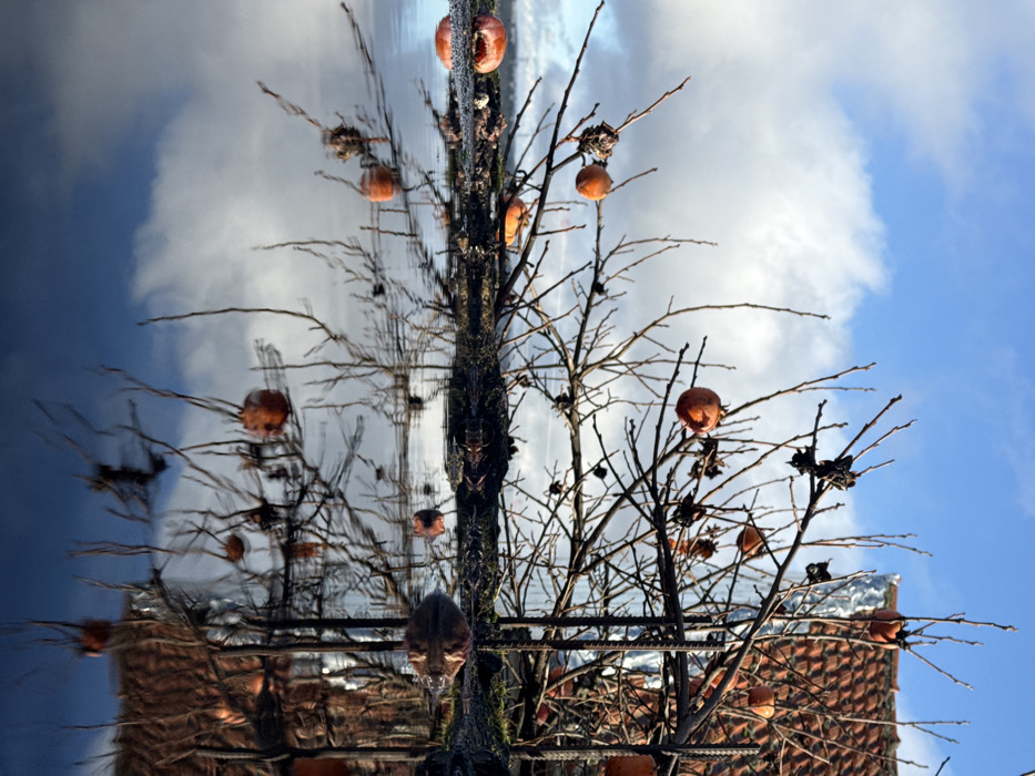 The image depicts a winter scene in Freixo de Espada à Cinta, Portugal. In the foreground, a large, still puddle of dark water reflects the sky, clouds, and surrounding elements. Several spherical, orange fruits, consistent with persimmons, are scattered on the dark, damp ground adjacent to the water, with at least one partially submerged and another appearing partially consumed. The midground features a leafless deciduous tree with numerous slender, dark brown branches, to which approximately ten to twelve similar orange fruits remain attached. Dark, shriveled organic material is also visible on some branches. A dark, angular metal structure, possibly a support frame or rebar, is interspersed with the tree branches on the right. In the background, a section of a building is visible on the upper right, characterized by a roof composed of reddish-brown terracotta tiles and an adjacent lighter, reflective surface. The upper left of the image displays a blue sky with scattered white cumulus clouds. No human subjects are present.