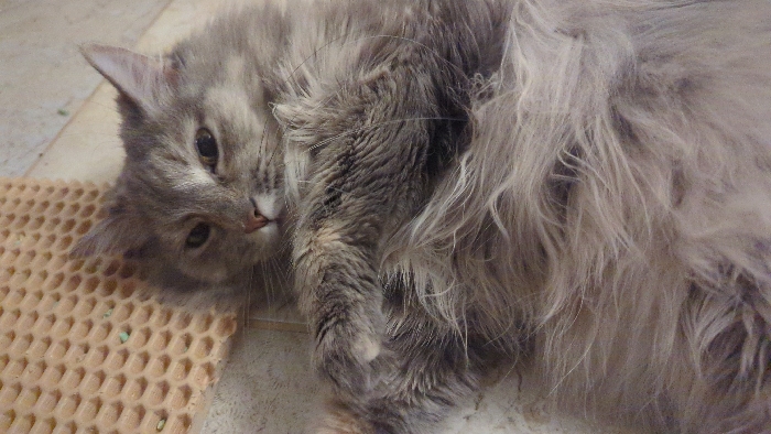 - "A long-haired grey and silver tabby cat lies on its right side on a light-colored tiled floor, looking directly into the camera" by FM-GWMq92, licensed under CC BY 4.0