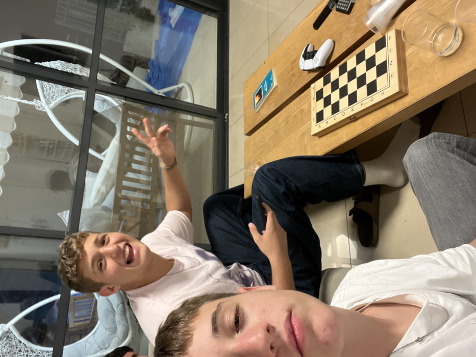 Three young men are captured in a candid moment. Two are visible from the chest up, wearing white t-shirts, one grinning and holding his hand up. A third, partially visible, wears gray jeans and white socks. A wooden table holds a chessboard, a white gaming controller, a remote, an eye exam card, and clear plastic cups. Outside, a window reveals patio furniture.