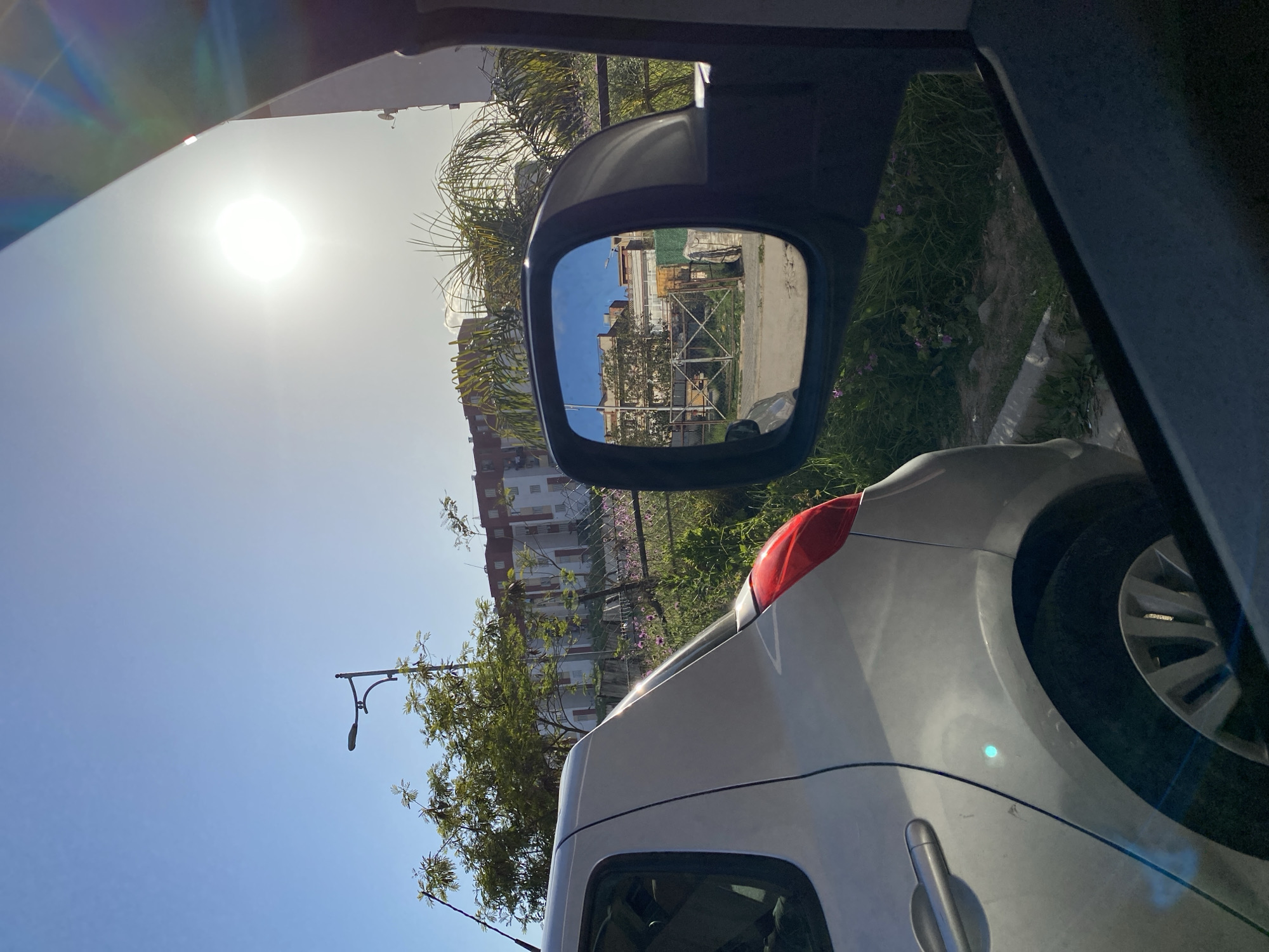 The image depicts a view from inside a vehicle in Baraki, Algeria. The sun is shining brightly in a clear blue sky. A side-view mirror reflects a street scene with buildings and scaffolding. The side of a white car, including a rear light and a tire, is visible in the foreground. There are trees and grass alongside the road. A streetlight is seen adjacent to the tree. The apartment blocks are also visible.