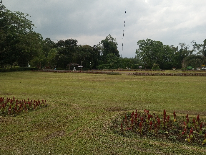 A wide expanse of green lawn stretches across the foreground, punctuated by flowerbeds containing reddish-brown plants. In the middle ground, a row of shrubs or small hedges separates the lawn from a more wooded area. A small gazebo and other structures are visible. A tall, striped tower rises in the distance. The sky is overcast, suggesting a cloudy day.
