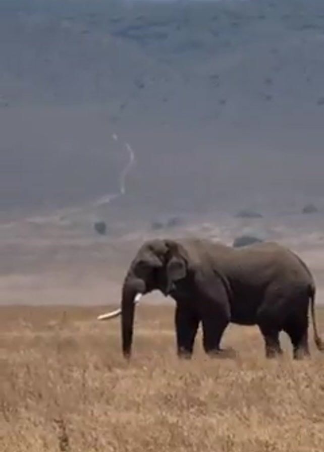 single elephant walking in a field. The elephant is gray and has large tusks. The field is covered in dry, brown grass. In the background, there is a mountain with a dirt road winding up it. The sky is overcast. The camera is static, but the wind can be heard in the background.