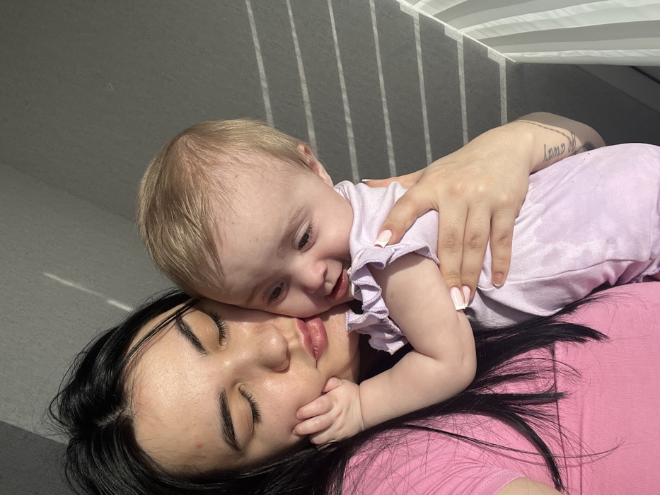 An adult female is depicted holding an infant in an indoor setting. The adult, with dark hair, is wearing a pink short-sleeved top. Her eyes are closed, and her head is tilted towards the infant, whose left hand is resting against her cheek. The infant, with light blonde hair, is dressed in a light purple, ruffled-shoulder garment and is looking downwards and slightly away, exhibiting a slight smile. The adult's right arm and hand support the infant's lower body, while her left hand is positioned near the infant's head, displaying pink manicured fingernails. The background consists of a plain, light gray wall. Strong, directional sunlight enters from the right, casting distinct parallel shadow lines horizontally across the wall, suggesting illumination through a patterned window covering. The image does not contain specific visual information to confirm a location within the city of Chaikovsky, Russia.