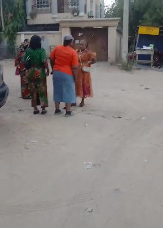 In a low-angle, outdoor shot, four women are seen standing and interacting on a dusty street in front of a large house. To the left of the group, a dark-colored car with a license plate is visible. The house is a multi-story structure with a beige exterior, a balcony on the second floor, and a brown garage door. The women are wearing a variety of outfits. One woman is in an orange shirt and a light blue denim skirt, another is in a long green dress with a colorful pattern, and the third woman is wearing a long, orange and brown patterned dress. The fourth woman is partially obscured behind the woman in green. They are all facing each other, engaged in conversation, with some of them gesturing as they talk. The street is sandy and littered with small pieces of debris. In the background, there is some greenery and a tall utility pole. The sky appears overcast, suggesting it could be late afternoon or early evening.