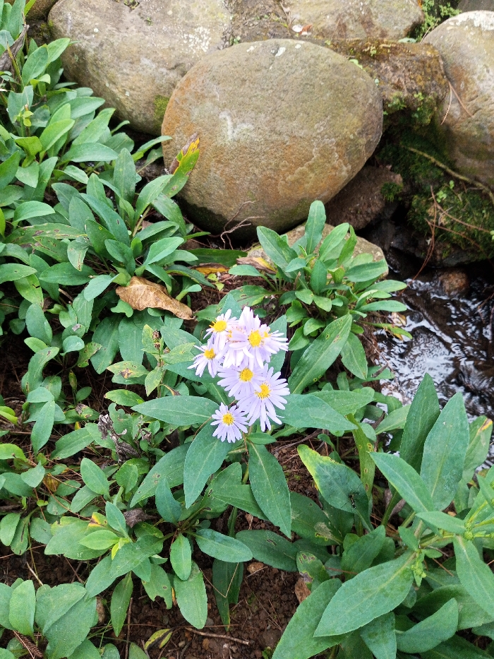 This image depicts a natural outdoor scene located in the city of Orehat, India. The foreground and midground feature dense green foliage consisting of various plants with ovate to lanceolate leaves. Centrally positioned is a cluster of approximately seven to eight light lavender to pale purple daisy-like flowers, each characterized by a bright yellow central disc. The ground beneath the vegetation is dark brown soil, with one dry, brown leaf present among the green growth. In the upper left and top portions of the frame, several large, rounded, light brown-grey boulders are visible, some displaying patches of moss. To the right, a narrow stream of clear water flows, exhibiting visible surface ripples. A small, dark-colored insect, possibly an ant, is observed on a green leaf in the lower right quadrant. No human subjects or their direct interactions are present in the scene.