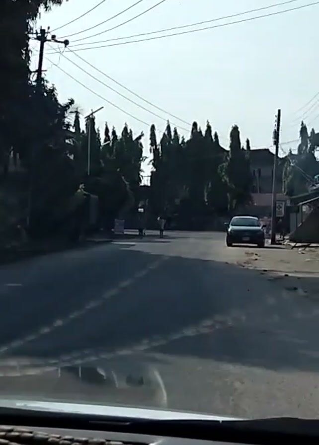 view from inside a car driving down a paved street in a sunny, residential area. The road is mostly empty except for two people walking in the distance towards the car, with one carrying something on their head. There is a dark-colored car parked on the right side of the road. The street is lined with tall, thin trees. Power lines are visible overhead. Buildings can be seen on either side of the road.