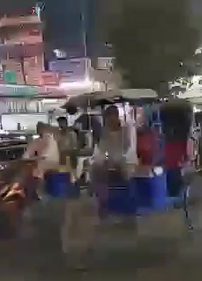 The video depicts a busy street scene at night. Several auto rickshaws, some with passengers, are seen driving and stopped on the road. There are some pedestrians walking around as well. The background consists of buildings, with various signs, some of which are illuminated. The overall atmosphere is one of urban bustle and activity. The lighting is provided by streetlights and vehicle headlights, which illuminate the scene.