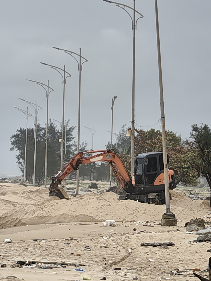 The image displays a sandy area, likely a beach or shoreline, in Thuận An Ward, Vietnam, under an overcast sky. A compact orange and black excavator is situated in the midground, partially obscured by accumulated sand, with its bucket embedded in a large sand mound. Behind the excavator, a row of tall, light-colored streetlights with curved, decorative arms extends into the background, flanked by a line of dark green trees with dense foliage. A body of water, likely the ocean, is visible on the far left horizon. The foreground consists of light-colored sand extensively scattered with various debris, including plastic items, organic matter, and fragments of rock. No individuals are present.