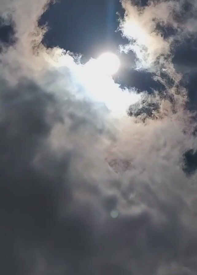 bright sun shining through fluffy clouds against a deep blue sky. The sun is intensely bright, causing a significant glare. The clouds are a mix of white and dark grey, indicating possible varied weather conditions. There is no other context provided in the video.